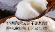 华炬科技新产品研究所技术咨询委员会科研人员现推荐一项一种酶解法高不饱和增香猪油制备工艺及步骤,该技术的有益效果: (1) 该技术采用胆固醇含量低、不饱和度高的肥膘为原料,采用温和的酶解法提取油脂,提取过程对不饱和脂肪酸的破坏小,制成的油脂相对普通猪油更适合食用、更健康。 (2)该技术利用酶解副产物的余香及发香潜力来给猪油增香,食用安全性有保障;烹煮发香后酶解副产物的会形成香味浓郁的香味成分,其一部分随蒸汽挥发丧失,另一部分保留在酶解副产物中,该技术增香工艺采用烹煮发香结合气调增香、固混增香,使酶解副产物烹煮后的挥发性香气成分和残留酶解副产物中的香气成分均能最大程度的与猪油融合,使猪油增香明显,因此相比于普通精炼猪油,该技术的增香猪油香味更加浓郁。 (3) 该技术猪油增香后,分离出的副产物汤汁感强、具有一定鲜度、滋味浓郁、脂香饱满,可用作方便汤包底料,达到原料充分利用的目的,现将该一种酶解法高不饱和增香猪油制备工艺及步骤及技术方案及实施例介绍如下供研究交流参考:(311211 334395)