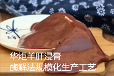 华炬新产品研究所技术咨询委员会科研人员现推荐一项羊肝浸膏酶解法规模化生产工艺,该技术的有益效果如下:(1)增加肝细胞破壁步骤,有利于细胞内物质的浸出(细胞质等);有利于肝中蛋白质与混合酶充分接触,极大的提高了酶解的效果;(2)采用生物酶解,相比酸水解或热水水解条件更温和,环境更友好,可以最大程度上将不溶于水的动物蛋白切割成可溶于水的氨基酸、短肽等有利于人体吸收的营养物质。比较之下,酸水解条件竣烈,有可能在水解过程中形成其他物质,有安全性隐患;而热水水解在高温状态下动物蛋白会发生蛋白凝聚现象,不利于水溶性物质的浸出。(3)用本工艺规模化批量生产肝浸膏,肝浸膏收得率达到28.5%~30.0%(含总固体≥70.0%);按总固体计算,肝浸膏含氮量大于13.0%,总有机氮转移率提高到90.0%以上(肝浸膏中总有机氮量与肝脏中总有机氮量的质量百分比)。相比现有酸水浸提法或热水提取法总固体收率仅有5%和10%左右,总有机氮转移率仅30%~40%大幅度提高。而这种提高不仅仅是测定数据的改变,而是使肝浸膏质量有了质的改变,可使肝浸膏最大限度的发挥营养价值,现将该羊肝浸膏酶解法规模化生产工艺及实施例介绍如下供研究参考:(311271 361305)