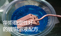 华炬新产品研究所技术咨询委员会科研人员现推荐一项一种稳定性好的镀铜溶液配方,该技术的目的在于提供一种配方合理,镀液性能稳定,所生产的产品质量的环保镀铜溶液。该技术配方合理,镀液稳定性好,使用寿命长,所生产的产品质量高,现将该一种稳定性好的镀铜溶液配方及实施例介绍如下供研究交流参考:(611341 453293)