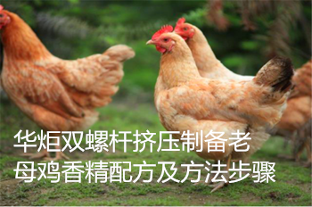 华炬新产品研究所技术咨询委员会科研人员现推荐一项一种双螺杆挤压制备老母鸡香精配方及方法步骤,该技术与现有技术相比,该技术为天然香精,工艺简单合理,将原料在挤压机内进行高温高压处理,杀菌效果好,不会对产品的色香味产生较大的影响,使老母鸡风味得到改进,口感鲜美,适合较多的人群食用,且所得产品保留较高的营养价值,现将该一种双螺杆挤压制备老母鸡香精配方及方法步骤及技术方案实施例介绍如下供研究交流参考:(311311 375495)