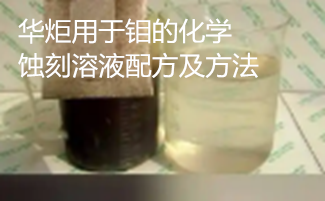 华炬新产品研究所技术咨询委员会科研人员现推荐一项一种用于钼的化学蚀刻溶液配方及方法,该技术的蚀刻溶液可在常温下使用,具有腐蚀速度快,侧蚀小,溶液使用寿命长和加工成本低等优点,即使在静止溶液中也可实现钼的快速蚀刻,现将该一种用于钼的化学蚀刻溶液配方及方法及技术方案实施例介绍如下供研究交流参考:(611511 373436)
