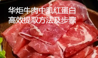 华炬科技新产品研究所技术咨询委员会科研人员现推荐一项一种牛肉中肌红蛋白高效提取方法及步骤,该技术通过优化步骤一中Tris-HCl混合缓冲液的pH值和提取时间、步骤二中肌红蛋白盐析液的饱和度,有效地提高了牛肉中肌红蛋白的提取量;该技术的Tris-HCl混合缓冲液中含有甘油和二硫苏糖醇,甘油在肌肉细胞浆内,形成了类脂膜结构,有效维持了肌红蛋白结构稳定性,更有利于其的快速沉淀析出,二硫苏糖醇避免了肌红蛋白部分敏感位点的氧化,保持了其还原性与生物活性,而后边搅拌边缓慢均匀缓慢均匀加入固体(NH4)2SO4进行盐析,能够实现分级沉淀,使盐析能有效提高肌红蛋白的纯度,4℃条件下沉淀蛋白质,能够防止温度升高导致肌红蛋白变性氧化,盐析后的透析可有效去除残留的(NH4)2SO4盐离子及其他小分子蛋白质,进一步提高肌红蛋白的纯度,最后进行凝胶过滤层析,将肌红蛋白有效的分离出来,而且不会破坏肌红蛋白的结构与功能,现将该一种牛肉中肌红蛋白高效提取方法及步骤及技术方案及实施例介绍如下供研究交流参考:(311241 321457)