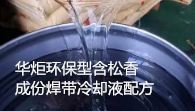 华炬科技新产品研究所技术咨询委员会科研人员现推荐一项一种环保型含松香成份焊带冷却液配方,该技术的优点是:该技术一种焊带冷却液,配方科学合理,冷却性能好,对焊带没有任何腐蚀,在冷却液中加入氯化钙及松香可延长焊带长期裸露在空气中不被氧化,使用方便,实用环保,生产简单,原料易得,极大的节省了能源,液体全部恽发后少量水溶性油增加焊带的光洁度,来延长焊带的保质期,不会影响焊接效果且松香吸附在焊带的表面,在使用焊带焊接组件时不需泡入助焊剂,现将该一种环保型含松香成份焊带冷却液配方及技术方案及实施例介绍如下供研究交流参考:(841131 521543)