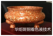 华炬新产品研究所技术咨询委员会科研人员现推荐一项斑铜着色液技术配方及应用,采用该方法生产的斑铜色泽华丽,且具有成本低,操作简单,颜色可控性好,可大规模生产等优点。在一定程度上缓解了生斑原料的紧缺状况,而且为斑铜的铸造成型和精细加工提供了技术上的保证;该技术着色液制备得到的斑铜颜色为暗红色或者红色,可用来制备各种工艺品色泽古朴华丽,由于制备过程反应时间较长,因此所述方法制备得到的斑铜颜色可控性很好,可根据时间的长短和个人的喜好控制所得斑铜的颜色,颜色厚重一点可以时间长一点,颜色鲜艳一点时间可以少一点,制备过程灵活可控;该技术所得斑铜稳定性很好,暴露在空气中不易变色,方便后续过程中打蜡和进一步加工;该技术所述斑铜原材料丰富,生产成本低,操作简单,制备过程不受产品形状的限制,现将该斑铜着色液技术配方及应用实例介绍如下供研究参考:(611341 351475)