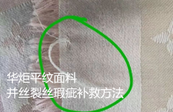 华炬科技新产品研究所技术咨询委员会科研人员现推荐一项平纹面料并丝裂丝瑕疵补救方法,该技术能更好更快恢复平纹面料衣服的并丝、裂丝问题,节省劳动力,缩短时间;方法简单易推广,广泛适用于洗衣店、洗衣厂及酒店洗衣房的平纹面料上的并丝、裂丝的瑕疵的恢复及补救。具有如下优点:1)节省劳动力;2)缩短处理时间;3)方法简单易推广,现将该平纹面料并丝裂丝瑕疵补救方法及实施例介绍如下供研究参考:(711331 261572)