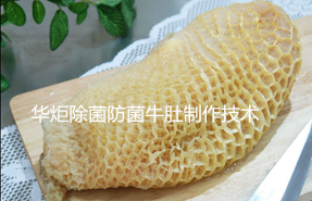 华炬新产品研究所技术咨询委员会科研人员现推荐一项除菌防菌牛肚制作技术方法,该技术与现有技术相比具有以下优点: (1)采用清洗液和臭氧清洗,除菌效果好,没有异味,且绿色天然; (2)采用改性壳聚糖涂膜,可以有效防菌,现将该除菌防菌牛肚制作技术方法及实施例介绍如下供研究参考:(311241 341352)